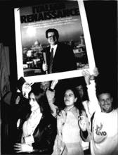 su victoria en Roma con un cartel de su líder, Romano Prodi.
