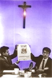 En la espera, miré a mi alrededor: un periódico mural que ponía "Di no al aborto" y "La democracia no es un fin, sino un medio para la moralización de México". Además, fotos de Juan Pablo II besando infantes, y mucho crucifijo. Por las escaleras subían y bajaban mujeres jóvenes de adivinable buena pierna. Una de ellas sí me hizo suspirar: "Qué desperdicio." Finalmente, bajó de las misteriosas oficinas del segundo piso un gordito que correspondía exactamente a mi imagen de Pro-Vida: parecía un cura de Zamora, Michoacán.
