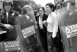 Ofelia Medina y Gloria Benavides, frente a las oficinas