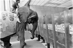 Ante la valla de granaderos, un elefante