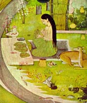 Qué nos dice, a ojo de pájaro, la miniatura? Sentada a la intemperie, una mujer escribe sobre la hoja de un baniano, árbol sagrado de la India. Sus largos cabellos negros le caen sobre la espalda. Tiene el torso desnudo. El resto del cuerpo está cubierto con hojas del árbol: su falda son las hojas. Frente a ella, muy cerca, corre un río; entre ella y el río, transversal a la curva que describe la ribera, hay una piedra blanca y en ella un lingam en yoni, el falo y la vulva simbólicos. Hay algo sobre la piedra, tres manchas verdes rayadas de rojo: son hojas escritas. A su espalda aparecen, en la parte izquierda, dos pequeños ciervos; a la derecha, también muy cerca, su casa, sencilla, construida con bambú; está abierta y deja ver los utensilios cotidianos sobre el piso cubierto de hojas frescas. Hay flores recién cortadas en el lingam. Hay flores en el pasto y en los sotos que crecen en la orilla. Hay garzas en la ribera y en el río.