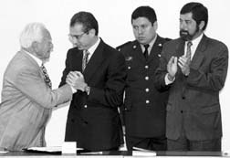 El presidente Ernesto Zedillo saluda a Clemente Robles, quien ayer
