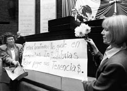 A una orden de Heriberto Galindo, presidente de la mesa directiva, el encargado de la crónica parlamentaria, Héctor de Antuñano, se avalanzó contra los líderes de deudores para sacarlos del salón. Los perredistas intervinieron, en especial Adriana Luna Parra, quien tomó uno de los cartones.