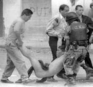 gráfica, captada en Quito, un policía es auxiliado por sus compañeros