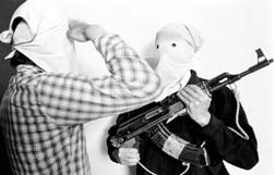 Como único uniforme, unas servilletas grises con pequeños agujeros que sólo dejan ver el iris de los ojos cubren las cabezas de todos los rebeldes, tanto las de la docena de combatientes que resguardan la casa de seguridad como las de los comandantes Oscar, Victoria y Vicente y la mayor Carmen. El pañuelo les da un aire de pájaros tristes. La expresión queda a cargo de las manos.