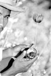 Un campesino en un lugar de Guerrero raspa la goma de opio con la