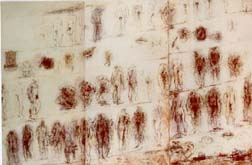 Así es: no se puede pretender lo contrario ni hay que hacerse preguntas de ninguna especie. Si te gusta y entiendes el mensaje de la instalación de botitas que avanzan siguiendo estratégico trayecto (obra de Eva Lootz en la Galería Luis Adelantado) bien, y si no, pues te aguantas. No sea que te crean "retrógrada" o "tradicionalista". Para entonces había visto buen número de obras de José Bedia, que se encontraba presente en ARCO, simpático, cordial y exitoso. Ya no mostraba a los balseros, tema con el que concurrió en una sección alterna a la Bienal de Venecia 1995, representado por una galería de Miami instalada en la Giudecca. De sus obras exhibidas en ARCO la que más me gustó fue un dibujo al carbón escueto, muy suelto y excelentemente resuelto. Otras cosas suyas me parecieron reiteradas. El dibujo se titula La anunciación, mide 109 x 80 y costaba $6,500.