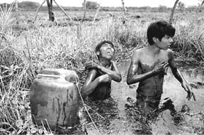 Los menores se cubren con diesel luego de limpiar aguas