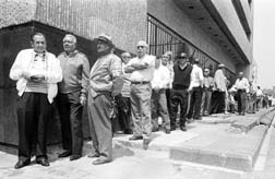 Fila de ex ferrocarrileros jubilados en el Banco Obrero,