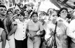 ``Aaaaaaaaayyyy, la democracia...'', gemían las mujeres que encabezaban el grueso contingente. Una vez más, la lluvia acompañó de principio a fin a los marchistas que recorrieron todas las calles del primer cuadro de esta ciudad con un ataúd negro: ``Democracia, descansa en paz'', se leía en sus costados.