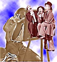 En la torre, Harpo toca el arpa extasiado, cual un moderno Nerón; la ``mujer surrealista'' y Jimmy contemplan el espectáculo, tendidos uno al lado del otro. Detrás de ellos, Chico, vestido con un traje de buzo, acompaña a Harpo en el piano.