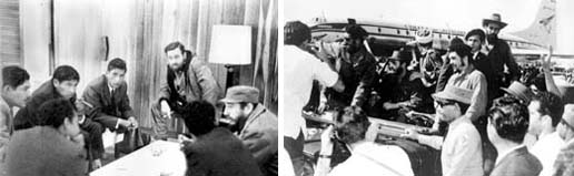 En la primera fotografía, Manuel Piñeiro, al centro, y Fidel Castro, a la derecha, durante una reunión con dirigentes latinoamericanos. En la segunda, recibimiento en La Habana al comandante Fidel el 26 de abril de 1959 a su regreso de un viaje a Venezuela; atrás de Guevara, Raúl Castro y Camilo Cienfuegos