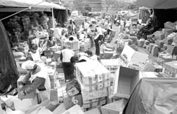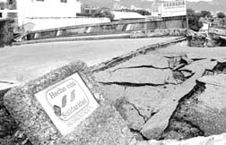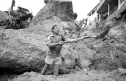 Un hombre saca arena debajo de un sitio donde pasaba la calle