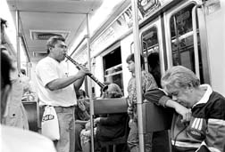 Músico tocando en la indiferencia subterránea.