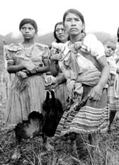 Mujeres de la comunidad recuperan algunas gallinas.