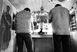 Dos creyentes colocan veladoras en la capilla de