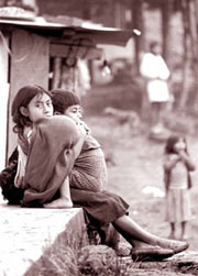 A la mañana siguiente visitamos los campamentos, resbalando entre el lodo. Aun ante la ausencia de las más mínimas condiciones de salubridad, alimentación, albergue, estas personas nos sonríen. Una mujer camina con dificultad: muestra en una pierna los efectos de la lepra de montaña. Un bebé de semanas nos ve con mirada de adulto. Una jovencita demacrada y con fiebre lleva a su bebé en brazos: sus ojos ya no son de este mundo. Un pequeño me obsequia una sonrisa débil; su hermanita mayor también sonríe, y en su palidez, en su semblante y delgadez, leo que muchos de los niños, hombres y mujeres que estoy viendo van a morir de enfermedad, de hambre, de frío.