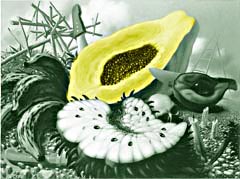 El interesado en obtener información más amplia sobre las connotaciones sexuales de esta fruta y la suerte de apoteosis que esas connotaciones disfrutan en la actualidad, debe acercarse a la obra del pintor cubano Ramón Alejandro (a quien Severo Sarduy dedicara la papaya de su Corona de las frutas), y buscar el libro ¡Vaya papaya!, con reproducciones de algunas obras del artista y texto de Guillermo Cabrera Infante. En medio de una vegetación lujuriosa, y entre presuntos artefactos de tortura, frutas de diversa y a veces misteriosa índole, perros, chivos, plumas de ave, troncos que al recostarse y trabarse improvisan inusitadas arquitecturas (como esqueletos de unas cubanas torres de Babel), máscaras, caracoles, cielos tormentosos y mujeres y hombres desnudos armados con machetes, la naturaleza cubana abre las piernas y muestra la papaya, igualmente abierta, gigante, golosa (``mantequilla de las frutas'' la llamó Lezama), llena de semillas desde cuyo brillo alguien parece enfrentársenos con la insolencia de esas ancianas que, clavando la mirada en la de sus interlocutores, pretenden adivinarlo todo. Si, como asegurara Gaston Bachelard, ``todo lo que brilla ve'', la entraña de la papaya es toda ojos.
