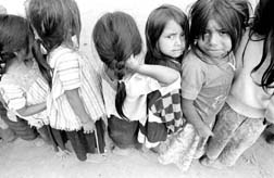 Fila de niñas desplazadas en X'oyep en espera de juguetes