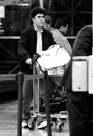 Había llegado a la ciudad en las primeras horas de la madrugada. Pantalón y chamarra de mezclilla azul. Camisa y zapatos negros. Pedro Almodóvar pasó casi inadvertido entre los parroquianos del salón Veracruz, donde cenó y se tomó una cerveza. Ahí se saludó efusivamente con Arturo Ripstein, quien le dio besos en ambas mejillas, y conversó brevemente con Jaime Puertas, director del Festival de Toronto, mientras la guionista Paz Alicia Garcíadiego y las actrices Marisa Paredes y Patricia Reyes Espíndola encabezaban la coreografía masiva del tema de Caballo Dorado: No rompas más mi pobre corazón... Antes habían bailado mambo, son y cumbia. A las dos de la mañana con siete minutos, Paredes y Almodóvar se retiraron, no sin antes aceptar posar con unos admiradores para la ``foto del recuerdo''.