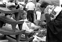 Mujeres otomíes compran hierbas comestibles en el tianguis de