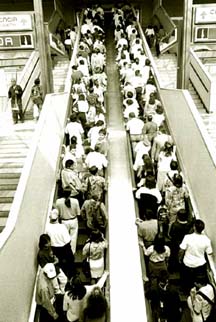 La multitud avanza unos metros y se detiene, muy cerca de los torniquetes. Los pasajeros quedan atrapados entre los barandales que sirven para conducirlos en orden. El cautiverio de las masas.