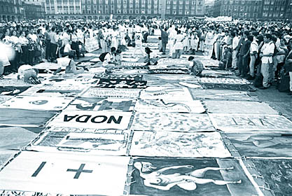 Despliegue de mantas en el Zócalo en memoria de los muertos por sida, durante la XI Caminata Nocturna Silenciosa, el día 29 de mayo. Los manifestantes, vestidos de blanco, con flores y veladoras, caminaron por Reforma hasta el Zócalo. Ahí habló el diputado del PRD Santiago Padilla, presidente de la Comisión de Salud de la Cámara de Diputados, Isabel Molina directora del DIF-DF, en representación de Cuauhtémoc Cárdenas, también habló un joven matrimonio con los rostros cubiertos por pasamontañas blancos: "Es nuestra manera de enfrentar el problema, porque no queremos que a nuestros hijos se les discrimine", dijeron e invitaron a la sociedad a que los ayude a quitarse la capucha.