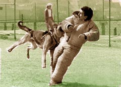 El perro se lanza hacia el talón derecho del sujeto que, pirueta de por medio, cae de espaldas. Trata de zafarse, pero Boris lanza la mordida a la entrepierna. Todo dura apenas unos segundos.