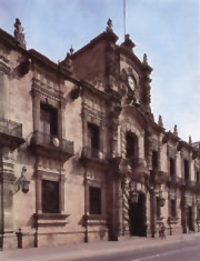 El Palacio de Gobierno resultaría más defendible estilísticamente con ciertas ornamentaciones de un churriguera menor y, dicen algunos, de un rococó que yo francamente no veo. De gusto militar y con los inevitables patios tan placenteros de los grandes edificios coloniales tapatíos, el Palacio, más que por su arquitectura, es hoy visto y visitado por lo que quizá sea el mejor Orozco, el Hidalgo de la escalera, especie de Pantócrator libertario, ígneo. El contraste del colorido un tanto infernal de Orozco con la atmósfera del edificio resulta feliz, y es que el Palacio -como toda la gran arquitectura virreinal de Guadalajara- está construido (o al menos terminado) con la maravillosa cantera amarilla de la región, que es, sin duda, una de las grandes canteras mexicanas, aquí de tonalidades ocres que, al paso del tiempo, se tornan en oro viejo.