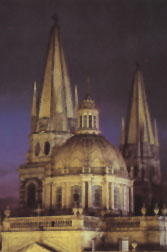 Y para ilustrar al arquitecto sobre lo que quería exactamente (y los obispos, al igual que las señoras, saben lo que quieren que les hagan los arquitectos), se sacó don Diego de por allí un plato de porcelana francesa que lucía el dibujo de alguna puntiaguda catedral gótica. Chartres, me imagino. Y con santa obediencia Gómez Ibarra le plantó a la catedral las torres góticas; sólo que, como en Guadalajara no había canteros franceses y el problema de los temblores seguía estando vigente, Gómez Ibarra decidió genialmente levantar unas torres muy livianas hechas con una bovedilla de cántaros de la Tlaquepaque vecina y recubierto todo con azulejo amarillo que además, claro, era muy impermeable a las humedades provocadas por las apocalípticas tormentas del verano tapatío. Y si no eran muy góticas las torres de Gómez Ibarra, sí resultaron resistentes a viento y marea y allí están, en la mitad de Guadalajara, como amarillo e insistente signo de identidad.