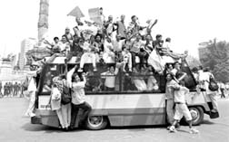 Un microbús hasta el tope con jóvenes fanáticos, a su