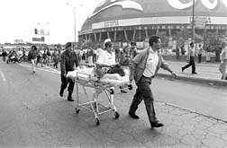 Una mujer embarazada es conducida en camilla en medio del bloqueo que