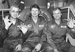 La nueva tripulación de la base espacial Mir está formada por el primer consejero de Defensa del presidente ruso Boris Yeltsin, Yuri Baturin, el comandante Gennady Padalka y el mecánico de a bordo Sergei Avdeyev. La imagen fue tomada en el cosmódromo Baikonur, en Kazaksta. Los tres cosmonautas despegaron rumbo a la vieja estación espacial el pasado 13 de agosto Ť Foto: Ap