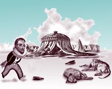 De manera incivil pateó un botellín. Que fue a parar frente a dos perros echados, a su llamativa conveniencia, en el pronunciado desnivel de la calzada por donde, según el rumor, pronto habría de construirse una gran vía. Maravilló a Miguel de Cervantes Saavedra la indiferencia de los perros al botellín y a su persona.