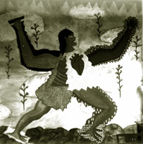 En cuanto terminamos de preparar los muros con gesso, a partir de todo aquello que me habían contado los de Alotepec, hice un boceto del mural y comencé a pintar un gigantesco guerrero mixe; mas cuál no sería mi sorpresa cuando de repente el síndico me dijo que ya no le siguiera, que porque a algunos del pueblo no les gustaba la idea de que se pintara el mural, sino que así, ya todo blanquito, se veía bien el palacio municipal.