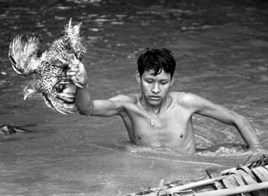 Un joven abandona su casa inundada en la