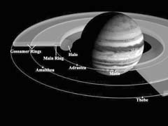 Geometría de los anillos en relación con Júpiter y sus cuatro pequeñas lunas internas (Thebe, Amalthea, Adrastea y Metis). Los científicos analizaron las imágenes obtenidas por la sonda espacial Galileo y anunciaron que los tenues anillos del planeta están hechos del polvo que se levantó cuando escombros cósmicos se estrellaron dentro de dichos cuatro satélites del gigante Ť Foto: Ap