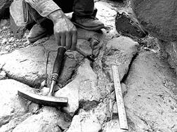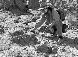 El paleontólogo boliviano David Keremba estudia la huella de un