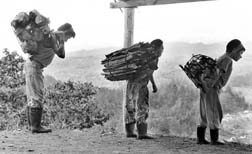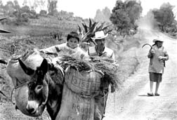 Una familia campesina regresa a su hogar luego de obtener pastura