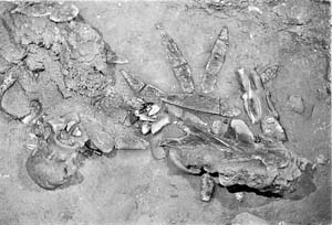 Un esqueleto humano rodeado por huesos de