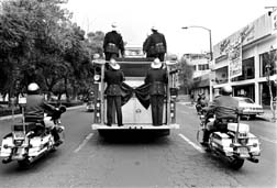 Escoltado por motociclistas y sobre un carro de bomberos, va el