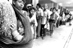 Largas filas de refugiados para recibir comida en un albergue. Foto: Duilio Rodríguez