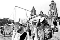 Integrantes de El Barzón cargan un ataúd con un deudor de la banca en su interior. Foto: Guillermo Sologuren