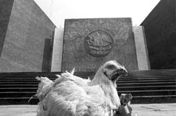 Los barzonistas dejaron gallinas pintadas de azul en el basamento