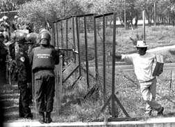 Un vendedor de paletas observa a los policías que resguardan el