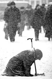 Una anciana rusa pide limosna en una calle del centro de la capital,