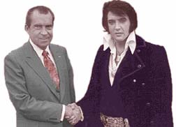 La desgracia del Elvis convencional es que no lo fue tanto. Las drogas, el alarmante sobrepeso, los descalabros sentimentales y el estilo de vida gangsteril lo descalifican como ídolo de la Gente Común y Corriente. En su mansión de Graceland, erigió un monumento al kitsch: las paredes de terciopelo azul y los muebles con acabado de poliuretano eran la decoración ideal para un propietario que usaba capas con incrustaciones de falsísimos rubíes. Las inmoderadas presiones de la celebridad transformaron al cantante en el voraz paranoico que merendaba seis hamburguesas con una pistola como único "cubierto" a la vista, y en el drogadicto que odiaba a los drogadictos. En una ocasión, el monarca se presentó ante Richard Nixon y le propuso un plan antinarcóticos de severidad nazi (sobra decir que mientras hablaba contra el vicio estaba profundamente drogado).