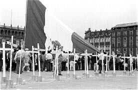 Izamiento de bandera en el Zócalo, frente a las cruces que simbolizan las muertes de migrantes mexicanos en la frontera con Estados Unidos n Foto: Frida Hartz