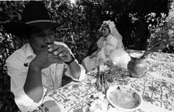 El indio ya no es sólo una silente sombra gris impresa sobre un papel, es también y sobre todo una figura colorida que transita, gesticula y habla en la pantalla. Ambas son imágenes construidas, fabricadas por el responsable del registro y su edición, pero sus códigos son distintos. Ante el video es difícil estar posando siempre, y una cámara que camina junto a uno se cuela literalmente hasta la cocina y nunca deja de grabar; acorta distancias, baja defensas y acaba, por cansancio, con la natural propensión al acartonamiento.