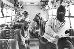 En la ranura de los pasamontañas asoman ojos que no tienen más de 30 años de mirar las cosas del mundo, él es bajo de estatura, ella esbelta y de poco castellano. Por momentos, Gabriel dormita sobre el cristal de la ventanilla, pero Mercedes mantiene su mirada en los encinos, los robles y los hilos de agua que escurren en los rincones de la sierra. ``En mi tierra también criamos mula, marrano, algo de ganado y maíz'', cuenta animado al mirar una vaca en la ladera.